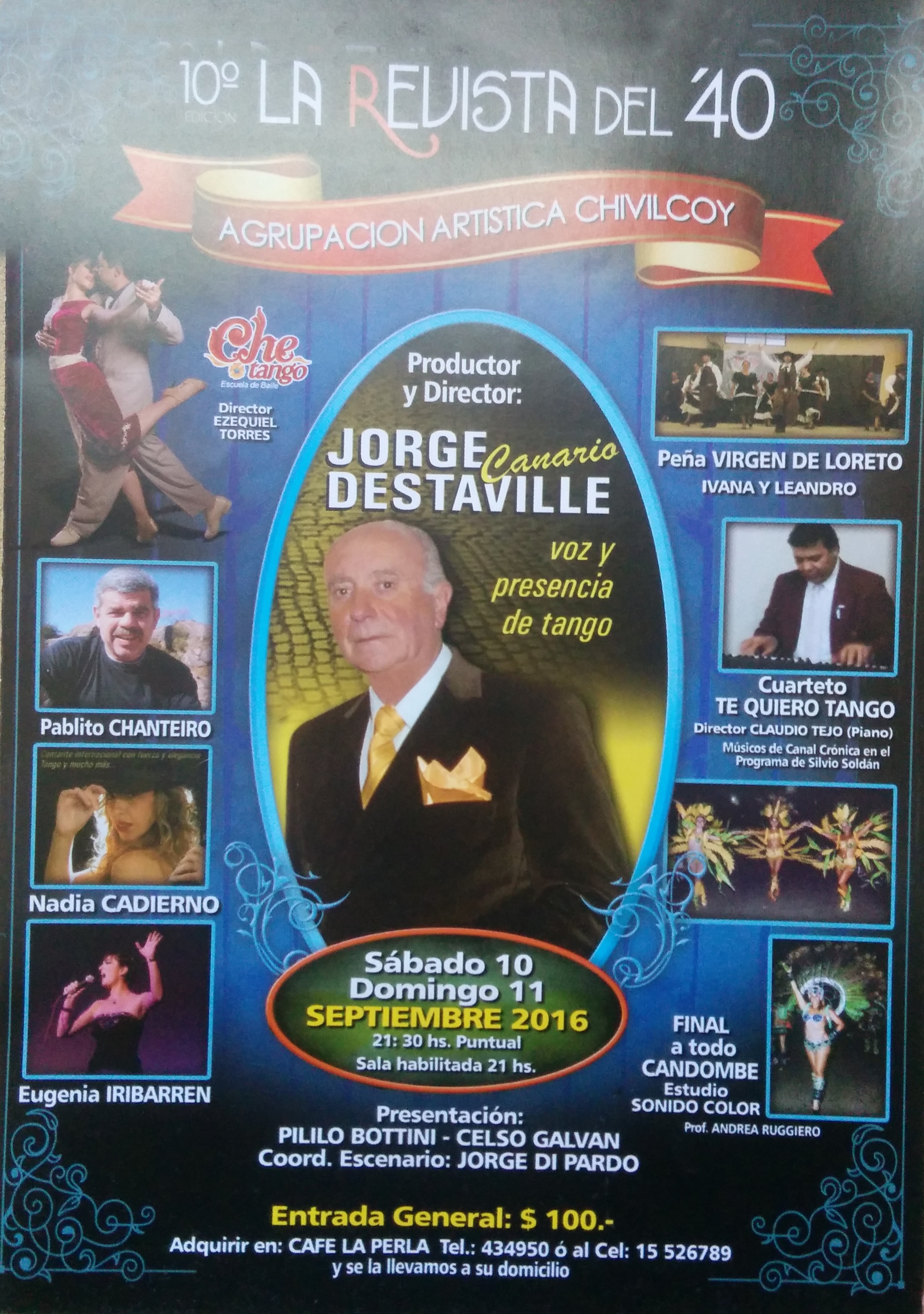 Los días, sábado 10 y domingo 11 de septiembre de 2016, se llevó a cabo, en la sala de la Agrupación Artística Chivilcoy, la edición décima de «La Revista del ’40», creada, producida y dirigida, por el conocido y destacado intérprete del Tango, Jorge Raúl Destaville. En dicho espectáculo, que contó con la presentación y conducción, de los distinguidos locutores y animadores, Héctor Amadeo Bottini y Celso Galván, hubieron de presentarse, el grupo «Che Tango», bajo la dirección de Ezequiel Torres; el actor Pablo Chanteiro; las cantantes, Nadia Cadierno y Eugenia Iribarren; los bailarines de la Peña Folklórica «Virgen de Loreto»; el cuarteto típico «Te quiero Tango», dirigido por el pianista, Claudio Tejo, y distintos componentes del Estudio «Sonido Color», de la profesora Andrea Ruggiero. Durante el transcurso de la noche, se entregaron diversos reconocimientos, a varias figuras, del quehacer cultural de nuestra ciudad. Jorge Raúl Destaville, nacido en 1935, acredita una prolongada y fructífera trayectoria artística, que se inició en la etapa de su infancia. El 25 de abirl de 1947, a la edad de 11 años, ya lo vemos sobre un escenario, participando en un festival, que se había organizado en beneficio, de los Bomberos Voluntarios, de Chivilcoy; breve tiempo después, de la auspiciosa y promisoria creación del cuerpo activo, de intrépidos servidores públicos, a comienzos de 1945. Posteriormente, Destaville, prosiguió con sus diferentes actuaciones; cosechando, en todo momento, la simpática adhesión y el sincero aplauso del público. Efectuó numerosas grabaciones; recorrió distintos lugares y rincones, de la provincia de Buenos Aires y del país, y por su iniciativa, en el mes de mayo de 2003, se bautizó con el nombre de «Esquina de Tango», a la antigua y ya tradicional, cafetería «La Perla». Jorge Raúl Destaville, es indudablemente, una voz y una presencia de Tango, incorporada a las páginas, el corazón melodioso y el sentir más profundo, de la historia de nuestra música popular chivilcoyana.