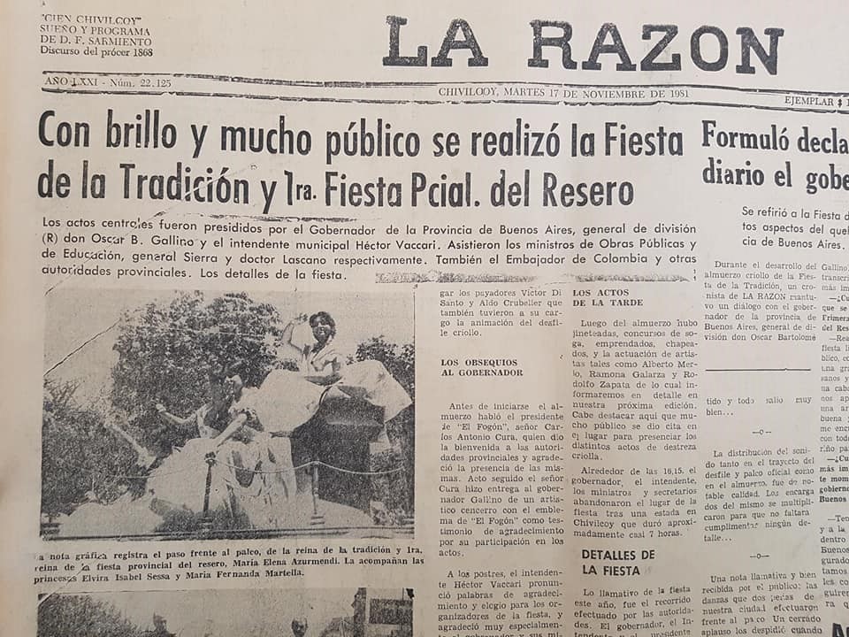 El domingo 10 de noviembre de 1957, el Centro Tradicionalista “El Fogón”, llevó a cabo, el primer desfile criollo – evocativo, en el cual intervinieron, numerosos jinetes, tropillas y carruajes de época. En la firma Hacendados de Chivilcoy, hubo de ofrecerse un almuerzo, y con posterioridad, se desarrolló, un ameno y atrayente programa, que incluyó la interpretación de música folklórica, bailes típicos y nativos, y carreras de sortija. La primera Reina de la Fiesta de la Tradición, elegida durante el transcurso de una reunión danzante, efectuado en el salón del Palacio Municipal, la noche del sábado 9 de noviembre de 1952, fue la señorita Marta Marsalla, que representó al club Social y Deportivo Cerámica Argentina. Durante varias décadas, de leal participación, y fervoroso compromiso, el inolvidable Don Roberto Reinoso (1923 – 2015), fue el glorioso abanderado, del desfile criollo – evocativo.