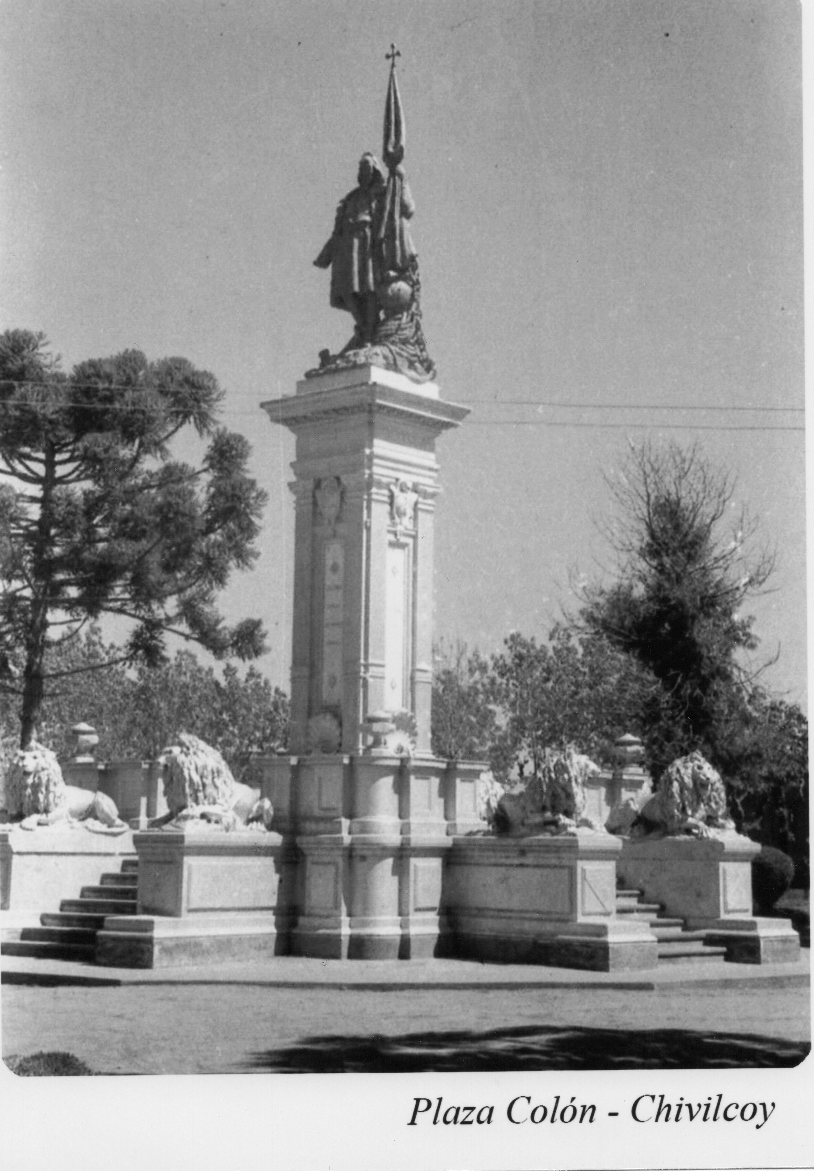 El Pueblo de Chivilcoy”, en los idiomas, castellano, italiano, francés y latín; respondiendo a una inteligente y ecuánime propuesta, del entonces titular de la parroquia San Pedro, presbítero Don Manuel Badano. El caracterizado y eminente jurisconsulto, magistrado, catedrático y hombre público chivilcoyano, Dr. Antonio Bermejo, fue el padrino, de tan significativa ceremonia, y al no poder concurrir al acto, por razones particulares, estuvo representado, por el inspirado y eximio poeta y diplomático, Leopoldo Díaz, oriundo, de nuestra ciudad. A este colosal monumento de Cristóbal Colón, levantando en 1892, en el centro de la plaza homónima, se lo considera, legítima y merecidamente, el segundo de América, en homenaje al inmortal Almirante, descubridor de un nuevo y promisorio continente, el 12 de octubre de 1492.